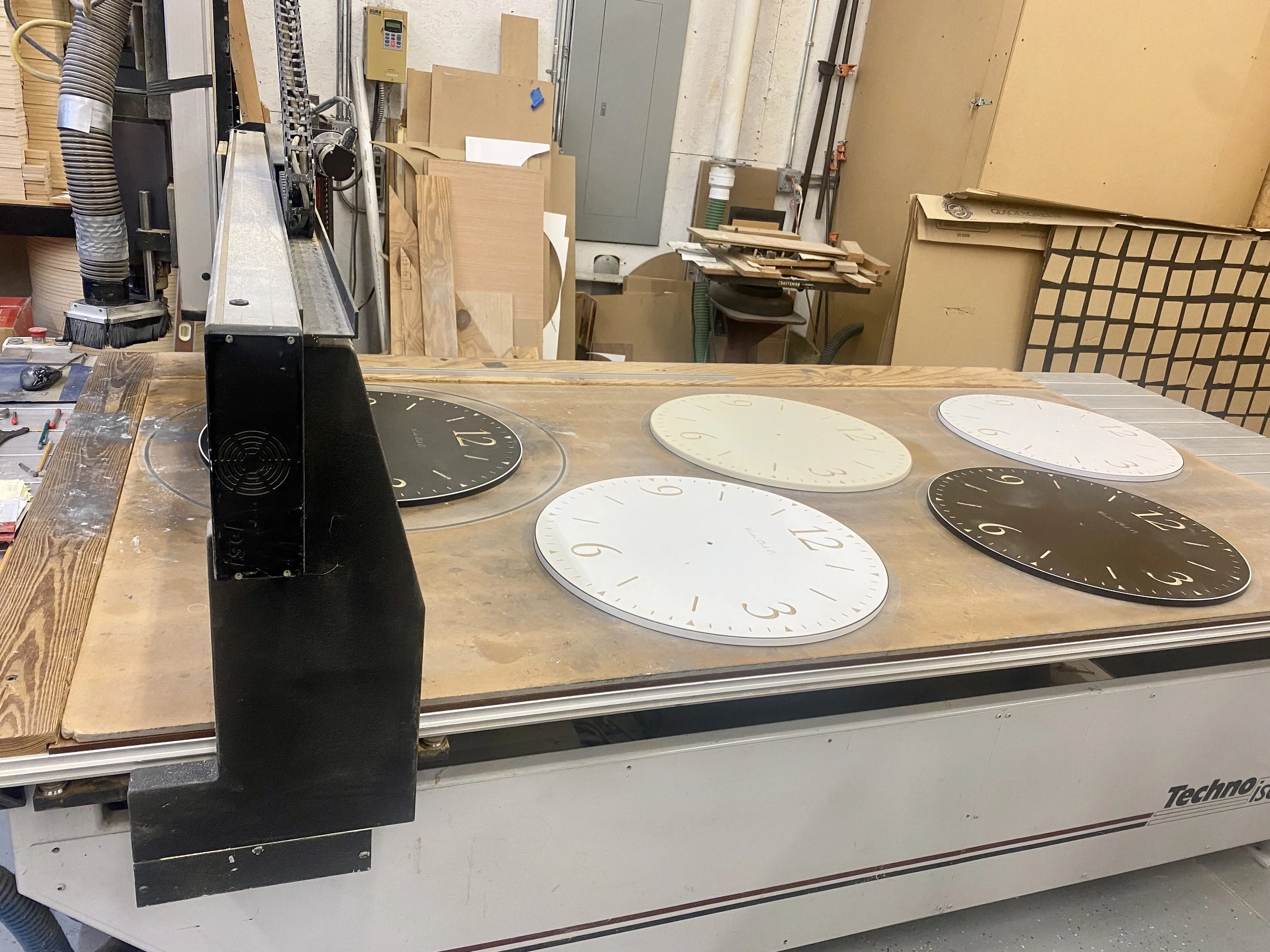 After the CNC machine sat in his garage for about 6 months, Stan crafted his first clock as a Christmas gift for his parents. 6 months later, he moved into the building he still occupies today and began making Wooster Clock Company clocks full-time.