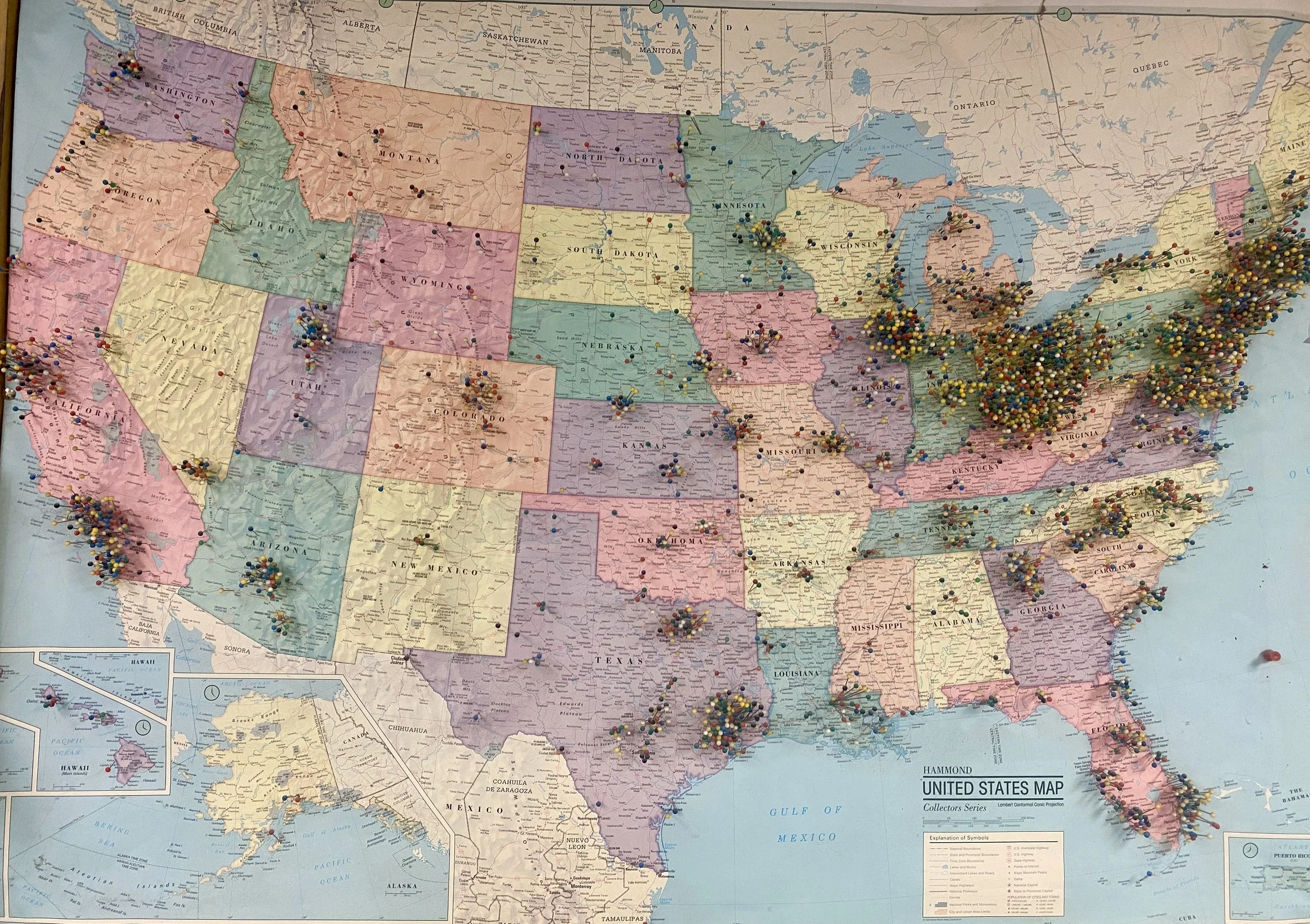 Each pin represents the location of where a Wooster Clock Company clock has been shipped across the U.S.