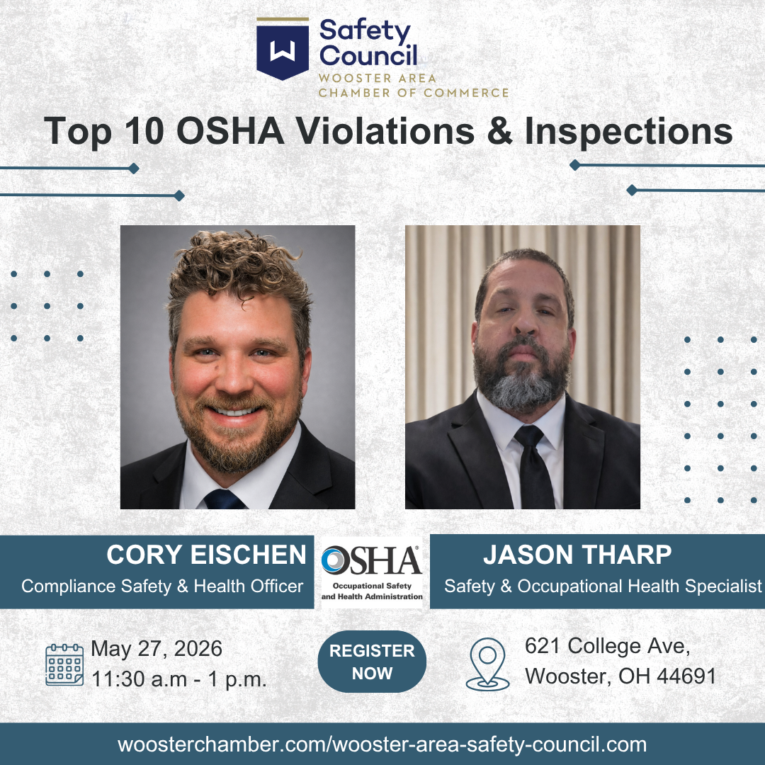 Workplace safety is an evolving landscape, and staying informed about regulatory trends is essential for protecting both your employees and your organization. At the next Wooster Chamber Safety Council meeting, we are pleased to welcome expert speakers from OSHA to lead a deep dive into the most common compliance challenges facing businesses today.